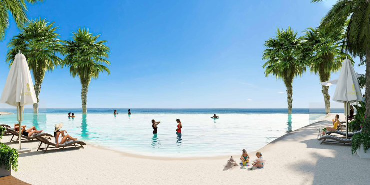 - ردهة فاخرة بثلاثة طوابق ومسابح بانورامية بإطلالة بحرية.